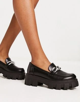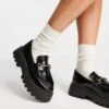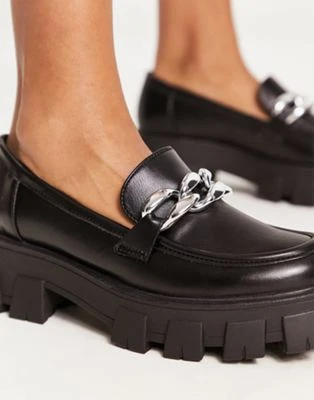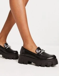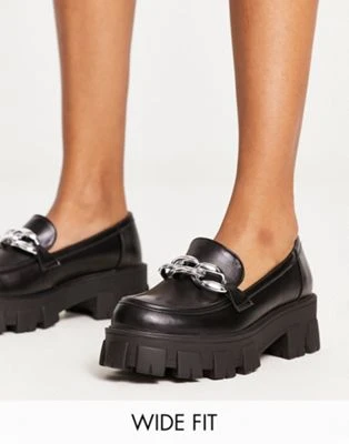 Glamorous Wide Fit – Mocassini A Pianta Larga Con Suola Spessa Neri Con Catenina Argento