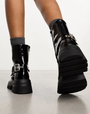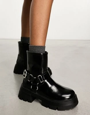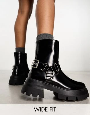 Public Desire Wide Fit – Blizzard – Stivali Stile Biker Neri Con Dettagli Stile Imbracatura A Pianta Larga